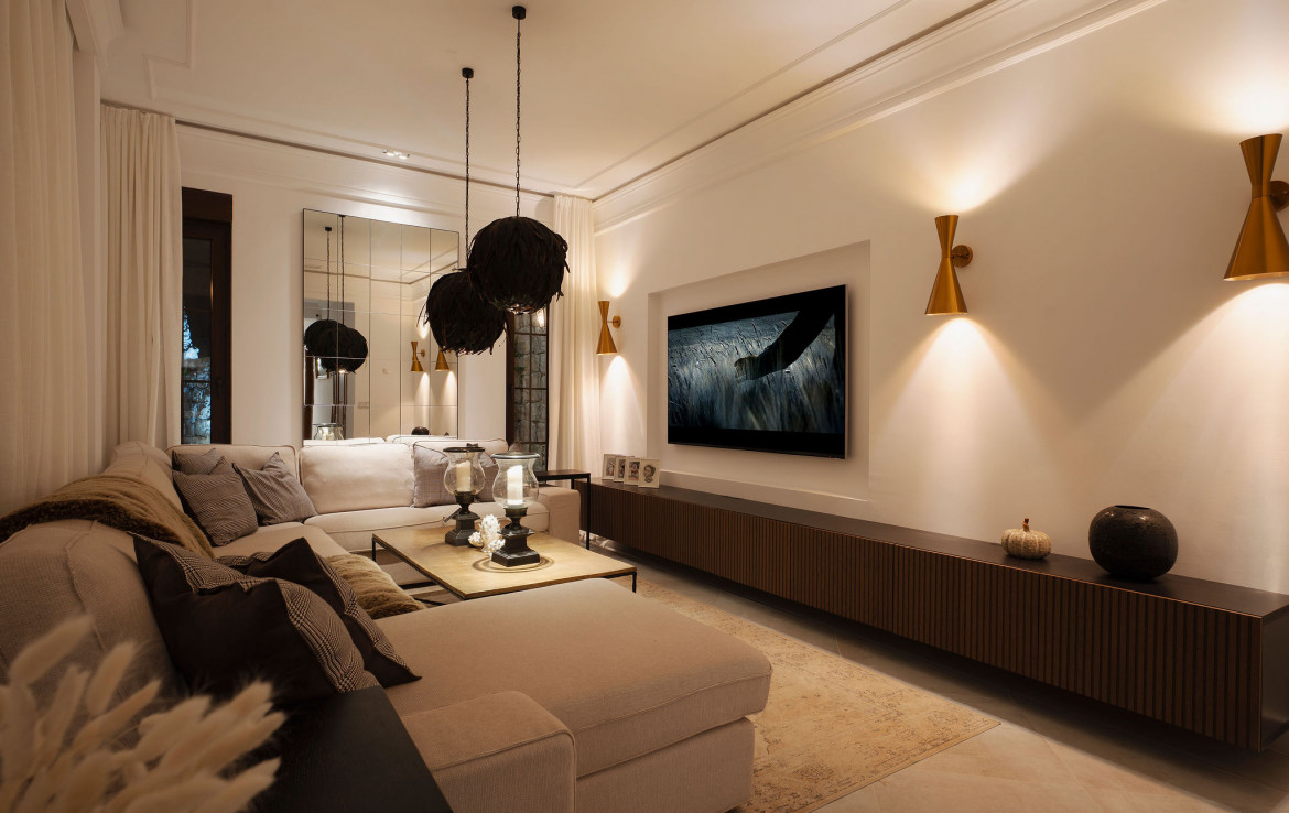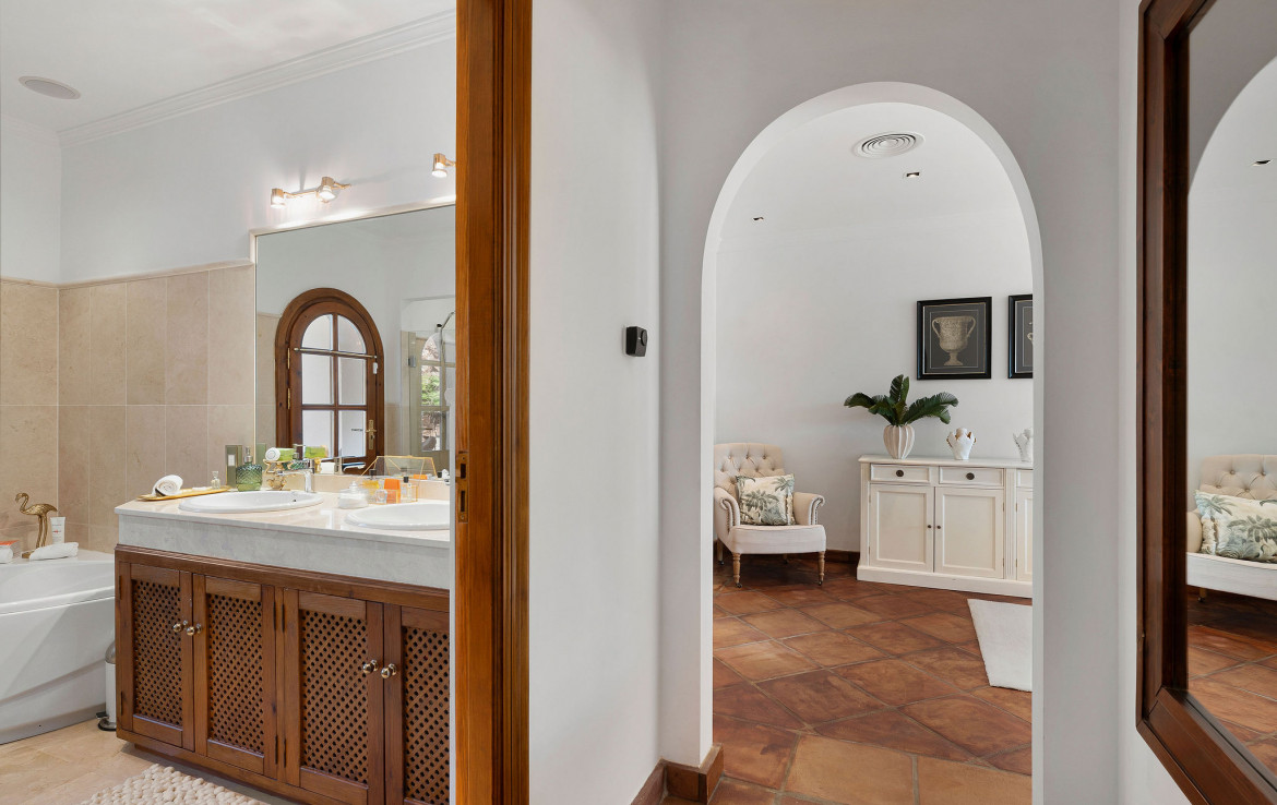 Inside the villa, traditional Andalusian architecture meets sophisticated contemporary interiors. High ceilings, graceful arches, warm natural materials, and spacious open-plan living areas create a timeless and inviting ambiance. Modern comforts include underfloor heating throughout, hot and cold air conditioning, a dedicated TV lounge, integrated surround sound, a home cinema room (easily convertible into an additional bedroom), a generous walk-in closet in the master suite, and an automated irrigation system for effortless garden maintenance.
