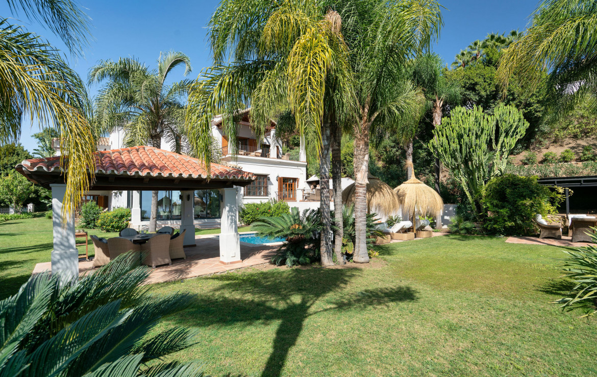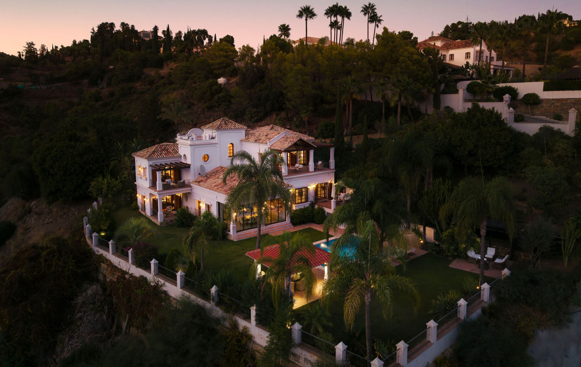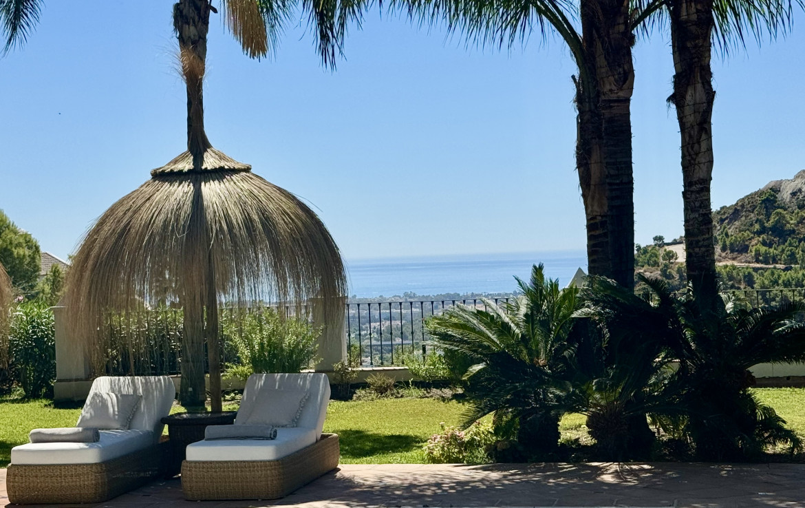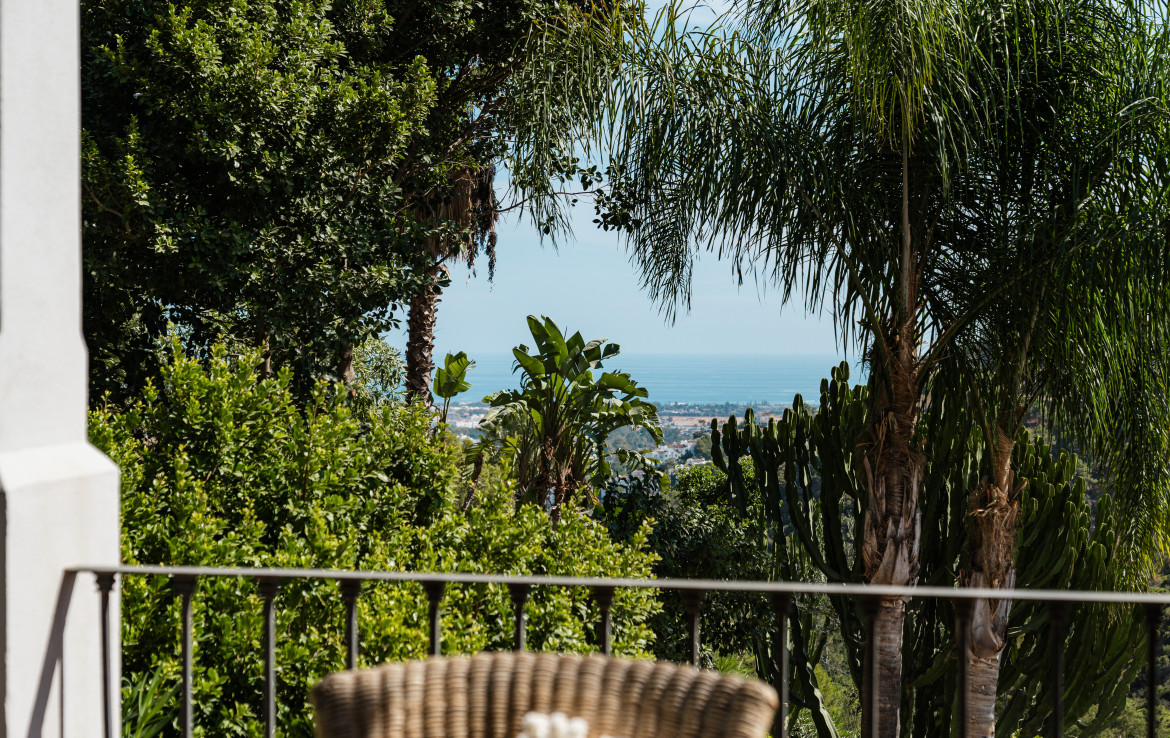 Set on a uniquely positioned and expansive plot surrounded by more than fifty mature palm trees, the villa stands out for its extraordinary setting and unchanging sea and mountain views. The south and southwest orientation ensures sun-filled interiors throughout the day, culminating in spectacular sunsets that bathe the gardens and terraces in warm natural light. The grounds are inspired by classic Mediterranean landscapes, featuring jacarandas, lemon trees, orange trees, and lush greenery that create a serene private retreat rarely found in El Madroñal.