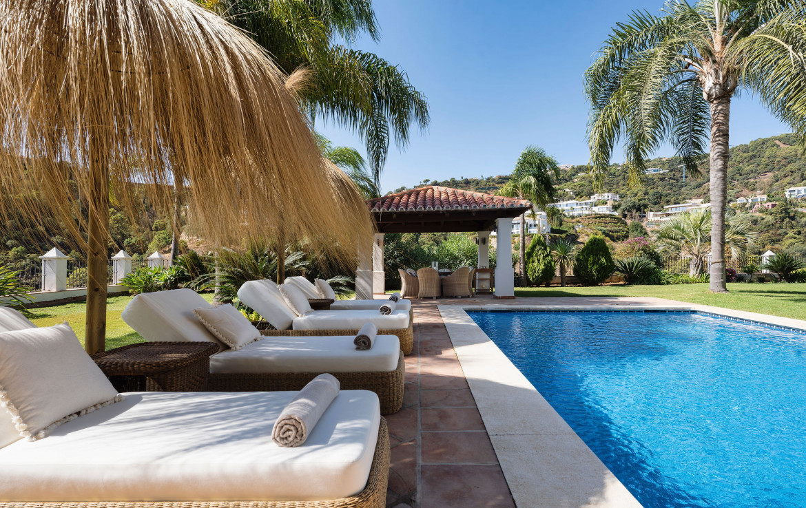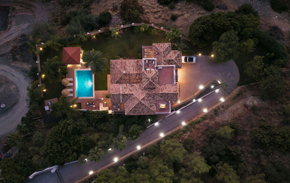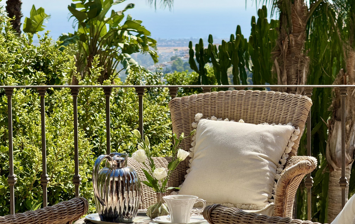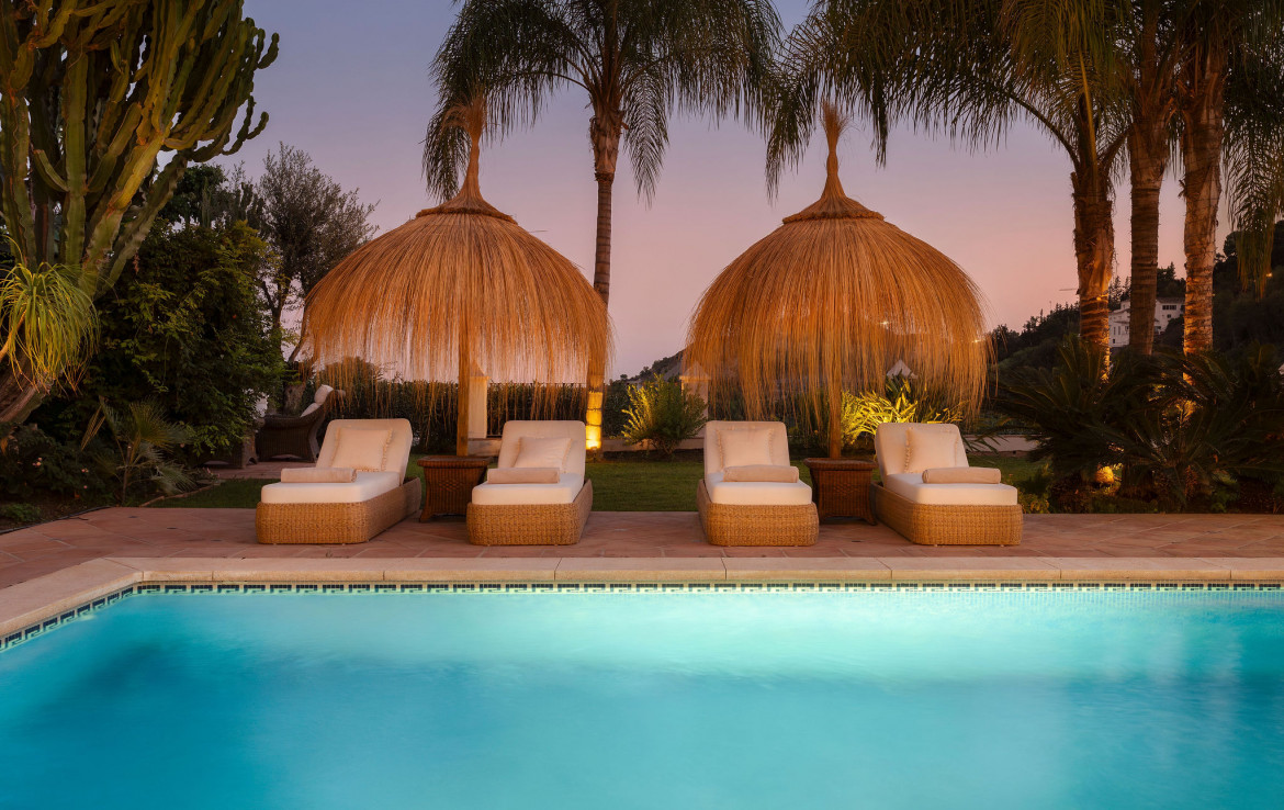 Set on a uniquely positioned and expansive plot surrounded by more than fifty mature palm trees, the villa stands out for its extraordinary setting and unchanging sea and mountain views. The south and southwest orientation ensures sun-filled interiors throughout the day, culminating in spectacular sunsets that bathe the gardens and terraces in warm natural light. The grounds are inspired by classic Mediterranean landscapes, featuring jacarandas, lemon trees, orange trees, and lush greenery that create a serene private retreat rarely found in El Madroñal.